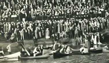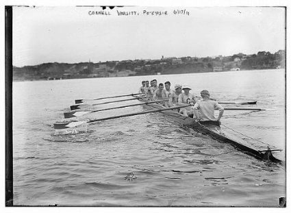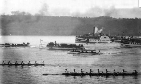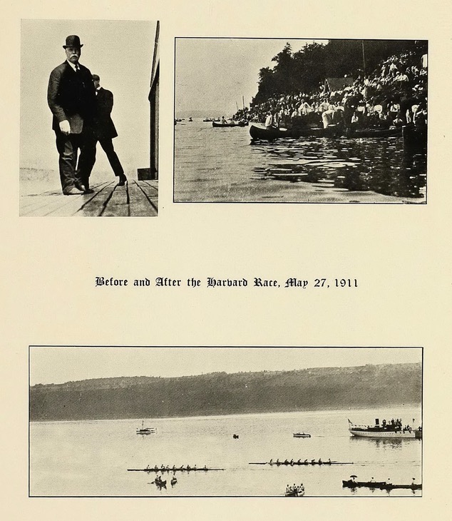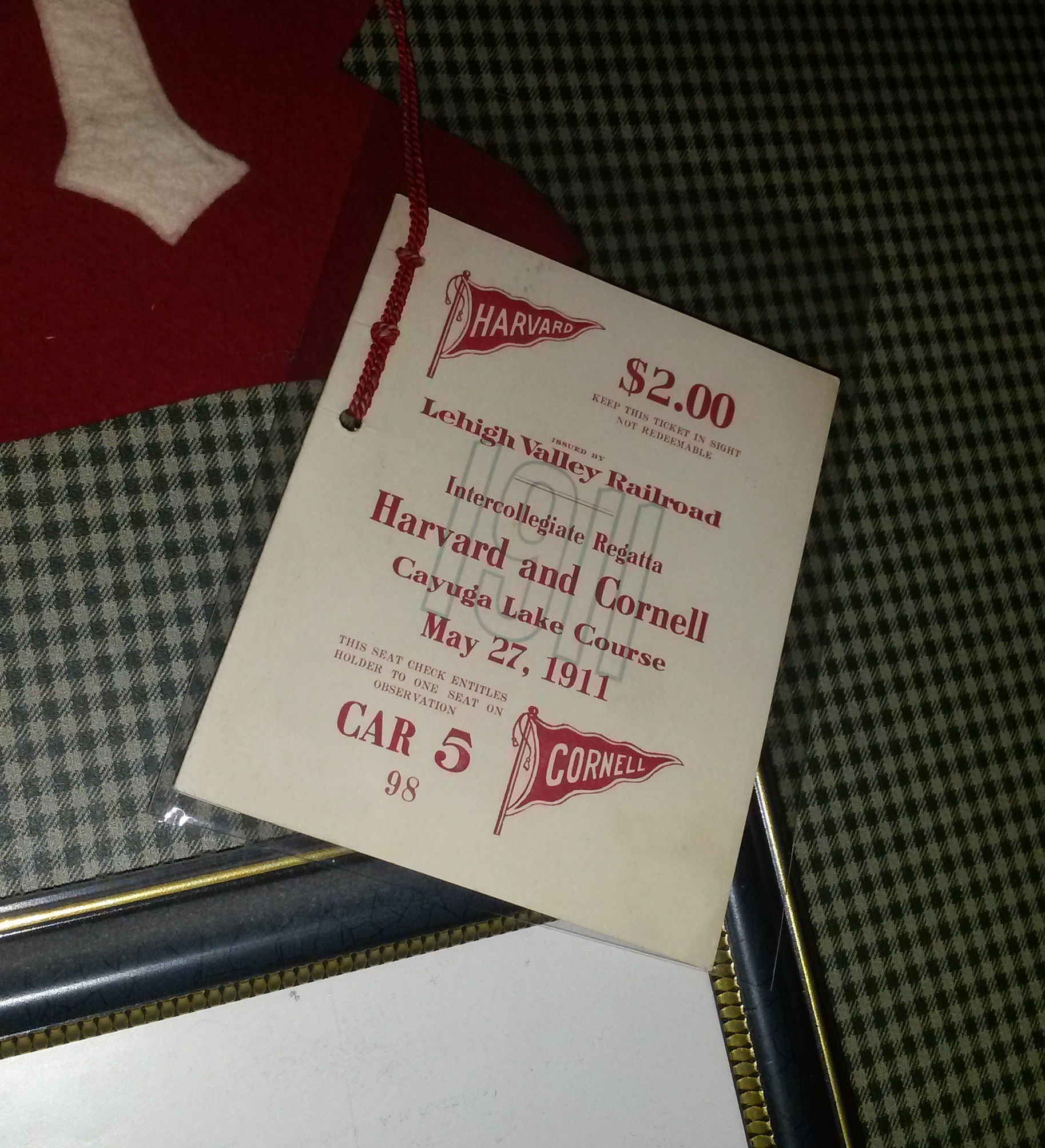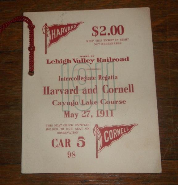 | Cayuga Lake Varsity Intercollegiate Regatta - Observation Train Ticket. Cornell – 1st vs. Harvard – 2nd, May 27th, 1911. Crew fans lined Cayuga Lake on and off the water. Those with tickets could ride the observation train that ran alongside the eastern shore during the races, keeping pace with the boats. |