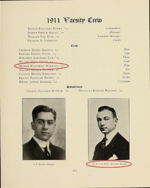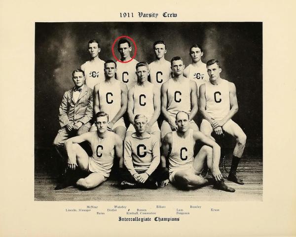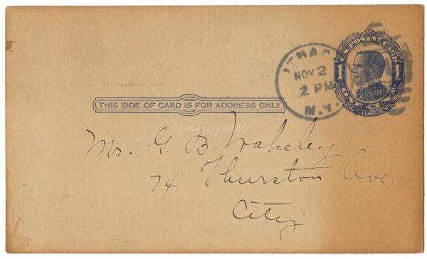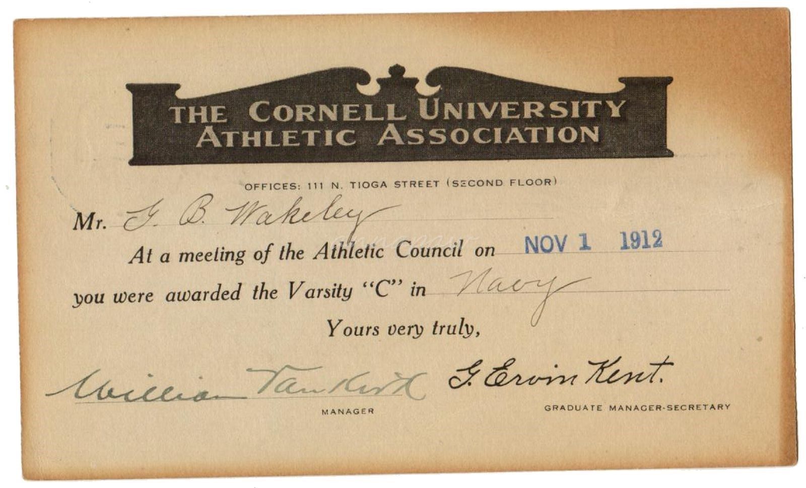 | Postcard from Cornell Athletic Assoc. awarding Varsity Letter "C" to George Blackman Wakeley. G.B. Wakeley was a varsity member of the Cornell Intercollegiate Champion crews in 1910, 1911, and 1912. |