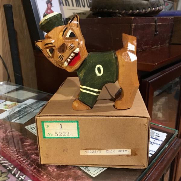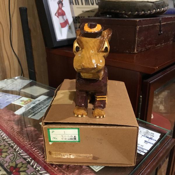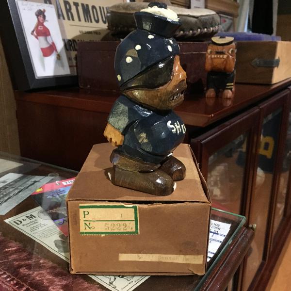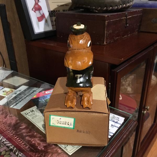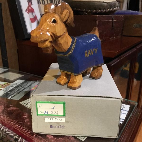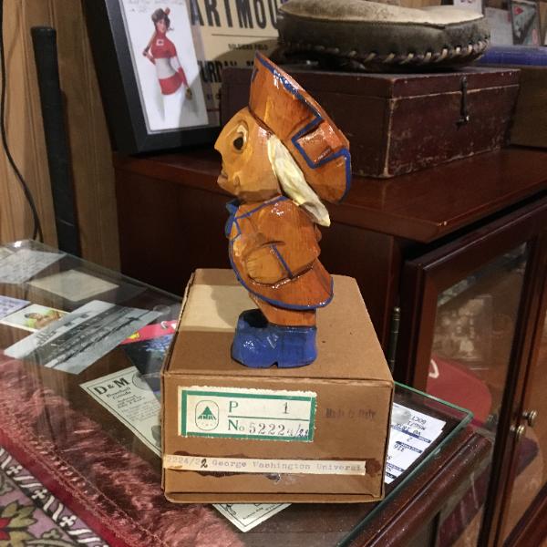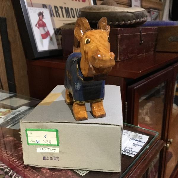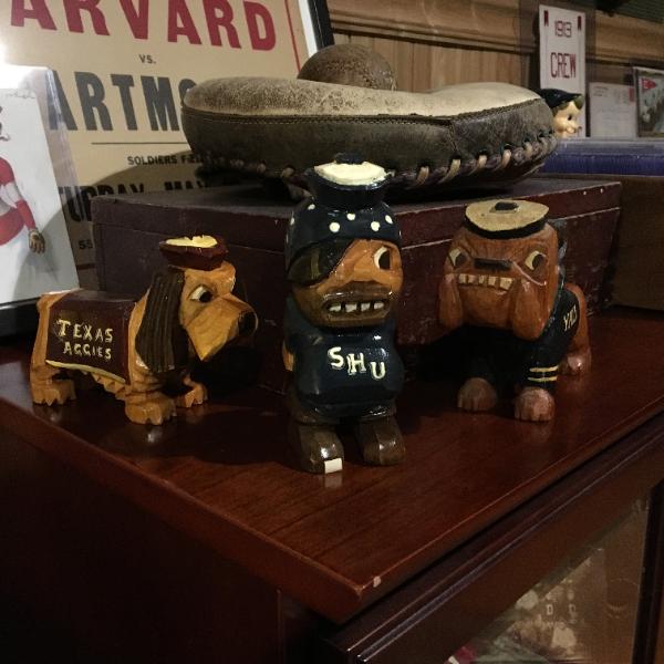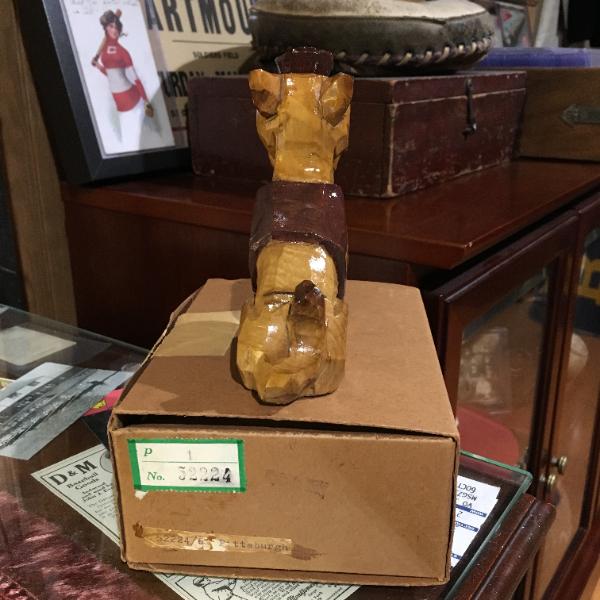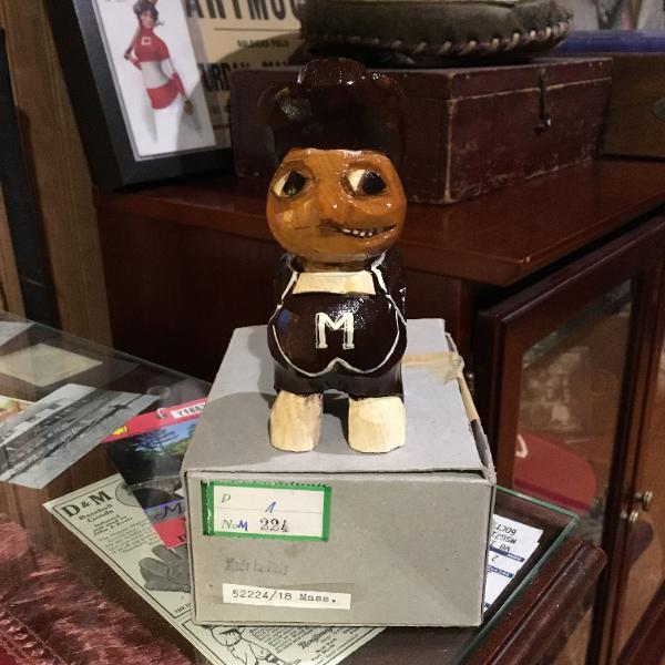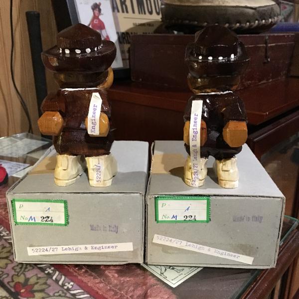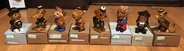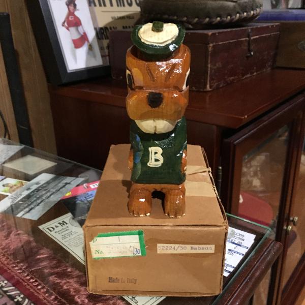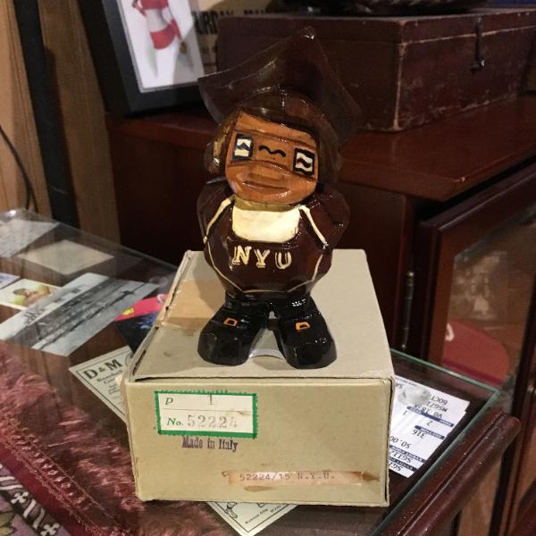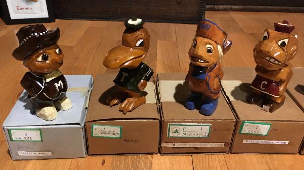 | c.1950 Anri Hand Carved Wood College Mascots - 5 inches Texas A&M, Seton Hall, UMass, Tulane, George Washington, Colgate, Babson, Illinois, NYU, Pitt, Ohio U., Lehigh, Army, Navy, Michigan These Anri Mascots are all NOS coming with the original 1950s boxes and labeling, including the tissue paper packaging and the original paper labels on the feet - all in pristine condition. They all came from old unopened stock discovered in a store in Nantucket. The owner of the store passed and her family liquidated her estate. She had a gift shop on the island of Nantucket. The mascots were in an old out building since the 50s, all new and never opened. The Estate Sale took place in Amesbury, MA, where over 1,500 mascots were sold for $6 a piece! There were 5” mascots, 2.5” and 1.5” mini mascots, letter openers and cork toppers. About a dozen of the Colleges had an abundant amount of Mascots, but there were a few schools with only a handful of examples– Army, Navy, CCNY, Seton Hall, and Manhattan. The rarest mascots were SMU(Pipe Stand), Illinois Wesleyan and Texas A&M, where there were only a couple examples. Some schools were only represented with 5” mascots, while others only had the mini mascots (Cornell, Columbia, Washington & Lee, Penn State). |