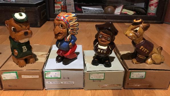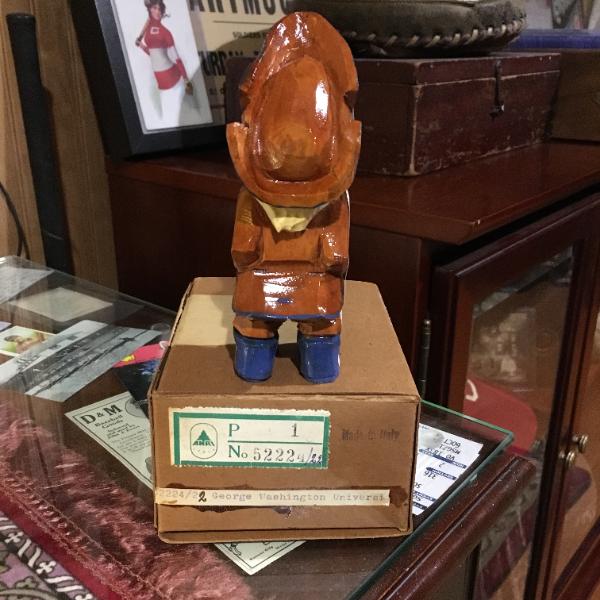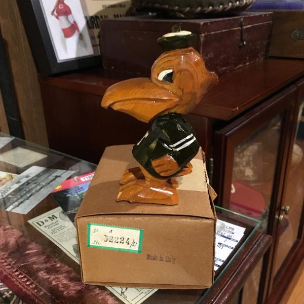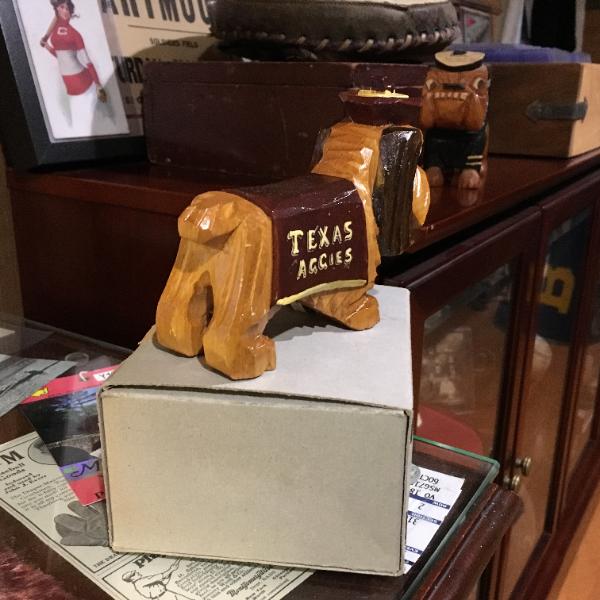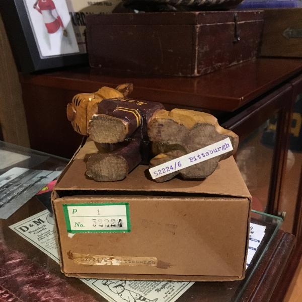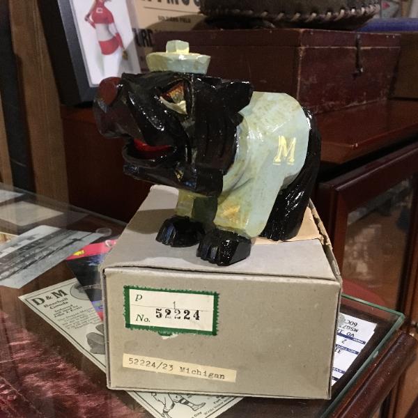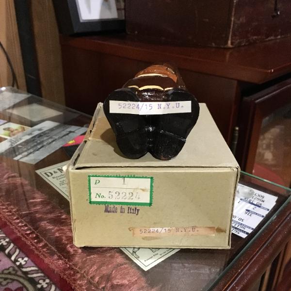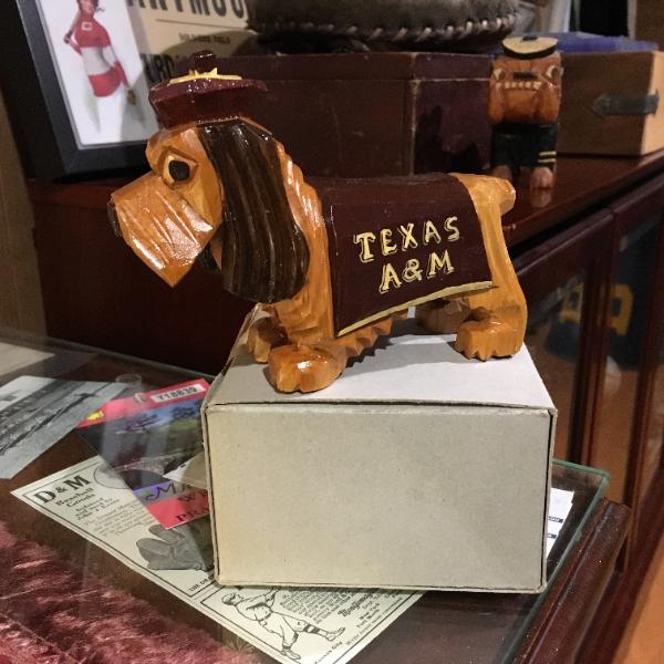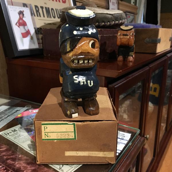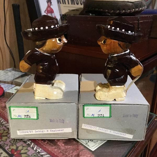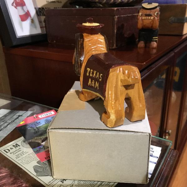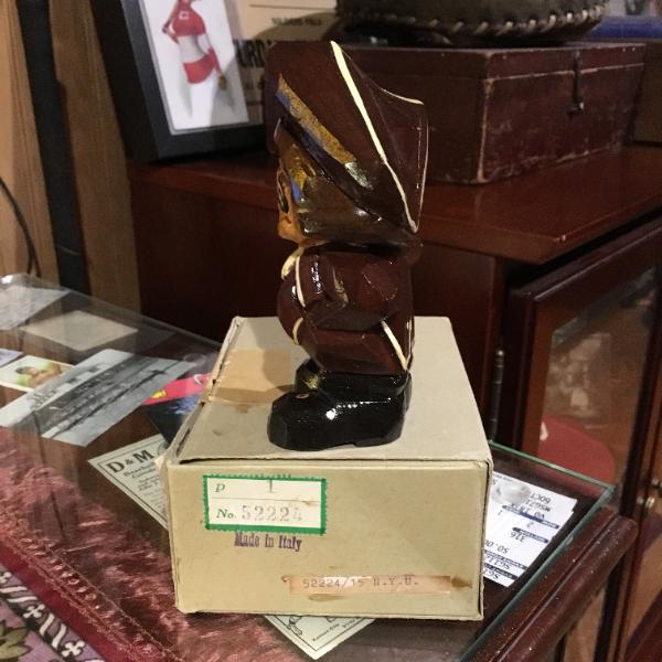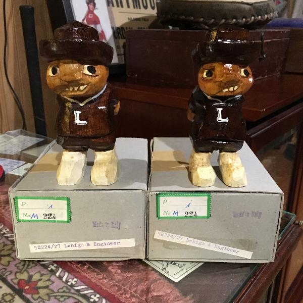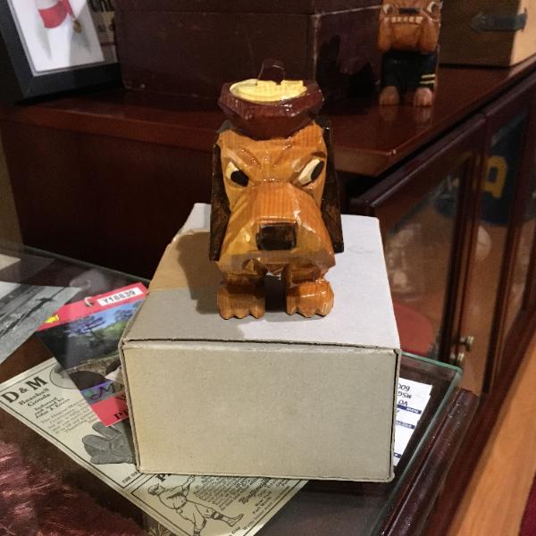 | c.1950 Anri Hand Carved Wood College Mascots - 5 inches Texas A&M, Seton Hall, UMass, Tulane, George Washington, Colgate, Babson, Illinois, NYU, Pitt, Ohio U., Lehigh, Army, Navy, Michigan These Anri Mascots are all NOS coming with the original 1950s boxes and labeling, including the tissue paper packaging and the original paper labels on the feet - all in pristine condition. They all came from old unopened stock discovered in a store in Nantucket. The owner of the store passed and her family liquidated her estate. She had a gift shop on the island of Nantucket. The mascots were in an old out building since the 50s, all new and never opened. The Estate Sale took place in Amesbury, MA, where over 1,500 mascots were sold for $6 a piece! There were 5” mascots, 2.5” and 1.5” mini mascots, letter openers and cork toppers. About a dozen of the Colleges had an abundant amount of Mascots, but there were a few schools with only a handful of examples– Army, Navy, CCNY, Seton Hall, and Manhattan. The rarest mascots were SMU(Pipe Stand), Illinois Wesleyan and Texas A&M, where there were only a couple examples. Some schools were only represented with 5” mascots, while others only had the mini mascots (Cornell, Columbia, Washington & Lee, Penn State). |