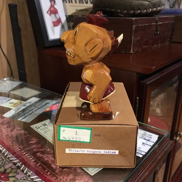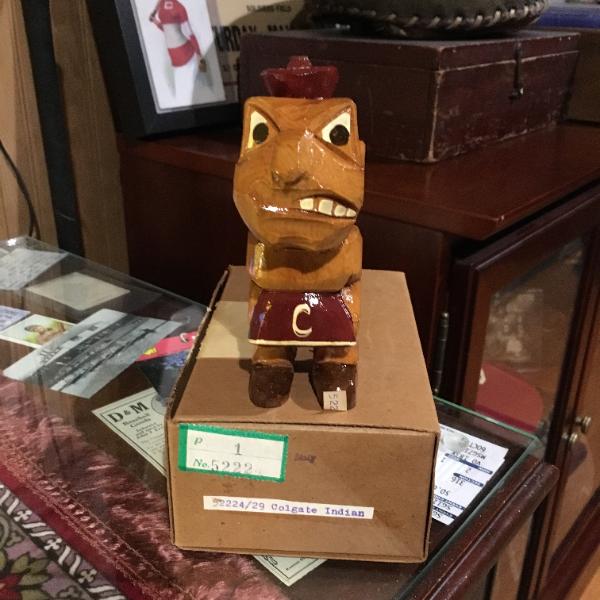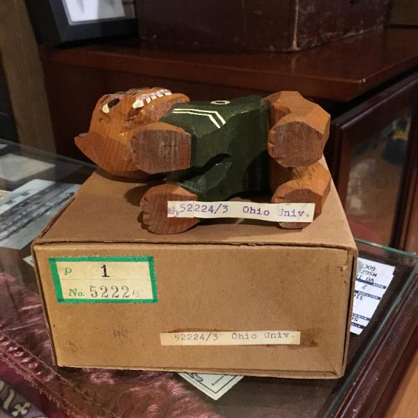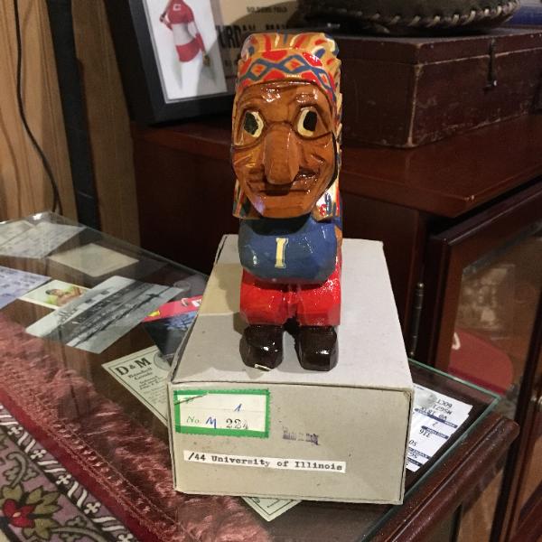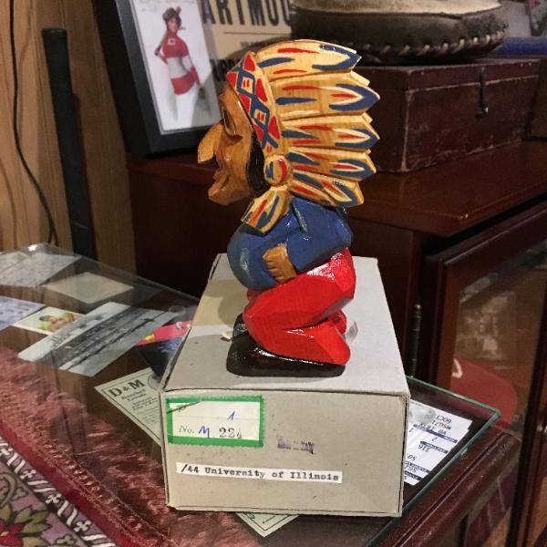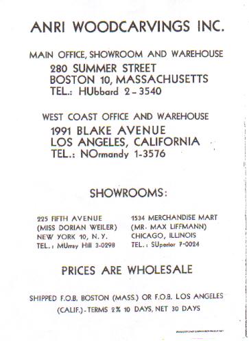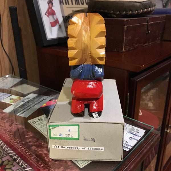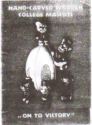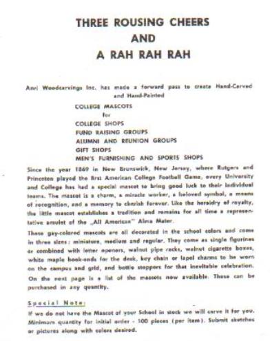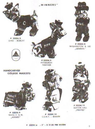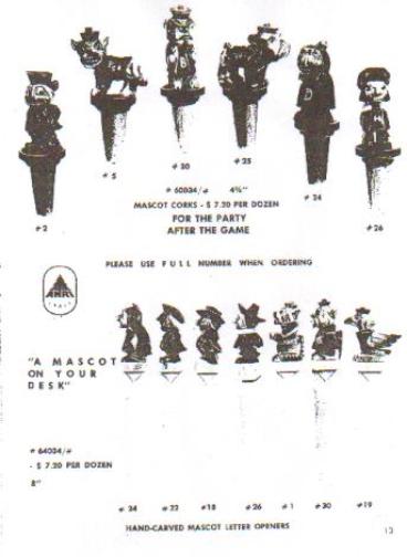 | 1950s ANRI College Mascot Catalog The catalog is fascinating. The company not only made the traditional mascot statues, but also bottle stoppers, letter openers, book ends, pins and cigarette boxes- all incorporating the wooden statues. The price for the standard statues were $21 per dozen. Below are copies of 6 pages of the 15 page catalog. |