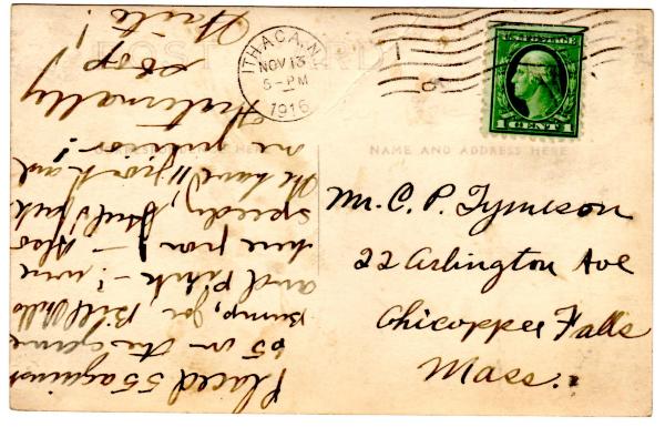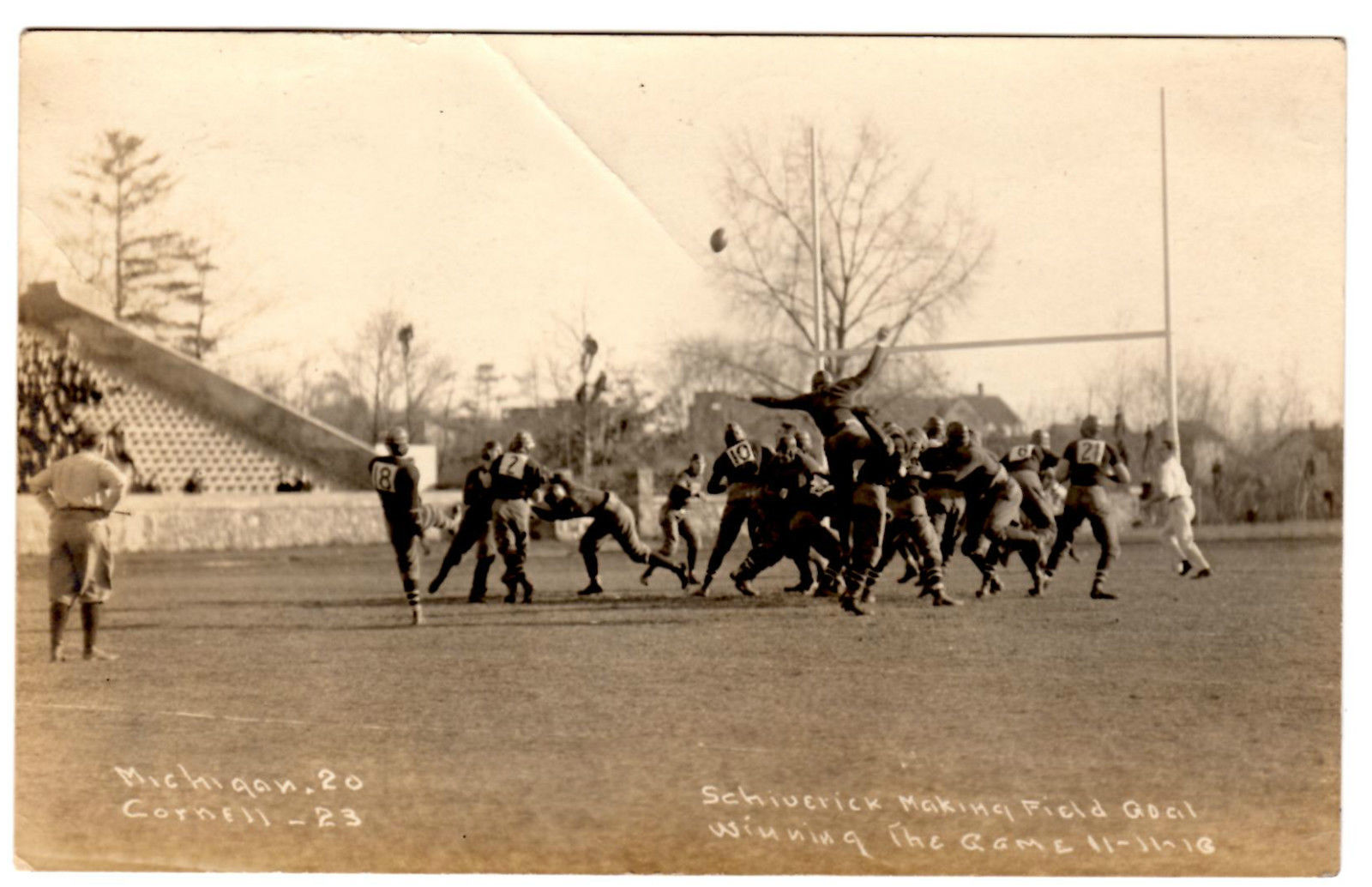 | 1916 Cornell v. Michigan Football Real Photo Postcard, RPPC Ithaca, NY. A strong Michigan team wins their first seven games, 7-0 all home games, with four shutouts, then travels east to face Cornell who won the National Championship the year before (Cornell beat Michigan 34-7 in 1915). Cornell was 6-1 at the time. Fabulous real photo postcard. Interesting message on back - "Placed 55 against 65 on the game." ..Gambling reference?? Postmarked Nov. 13, 1916 from Ithaca NY, which is amazing considering the game was on a Saturday two days prior (Nov. 11, 1916). Photo taken by John P. Troy Troy was the official Cornell University photographer from 1900 - 1928. Photos of events, campus views and athletics appeared in every Cornell publication from yearbooks to calendars. Troy was an iconic fixture at Cornell for over a quarter century. When he retired in 1928 his studio had over 20,000 negatives. |