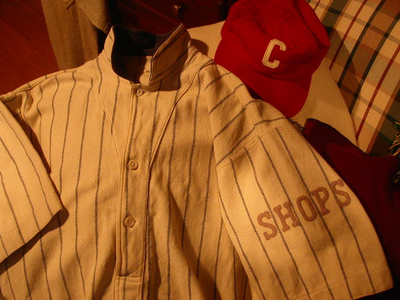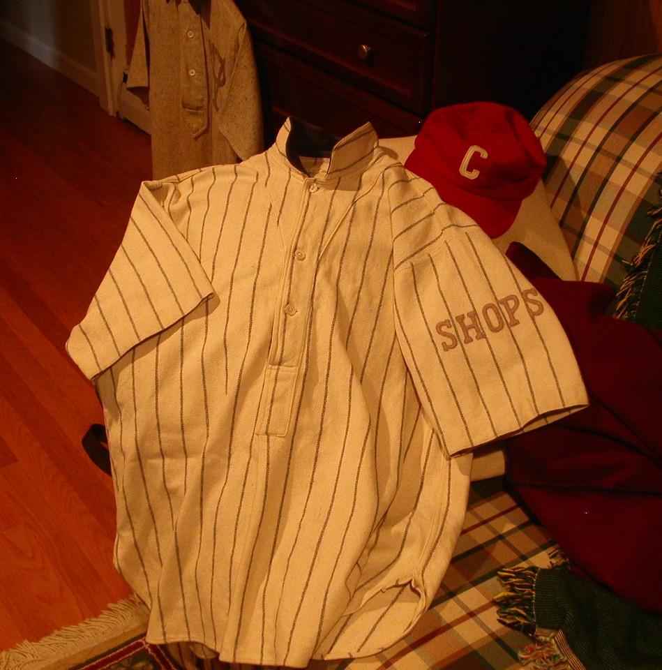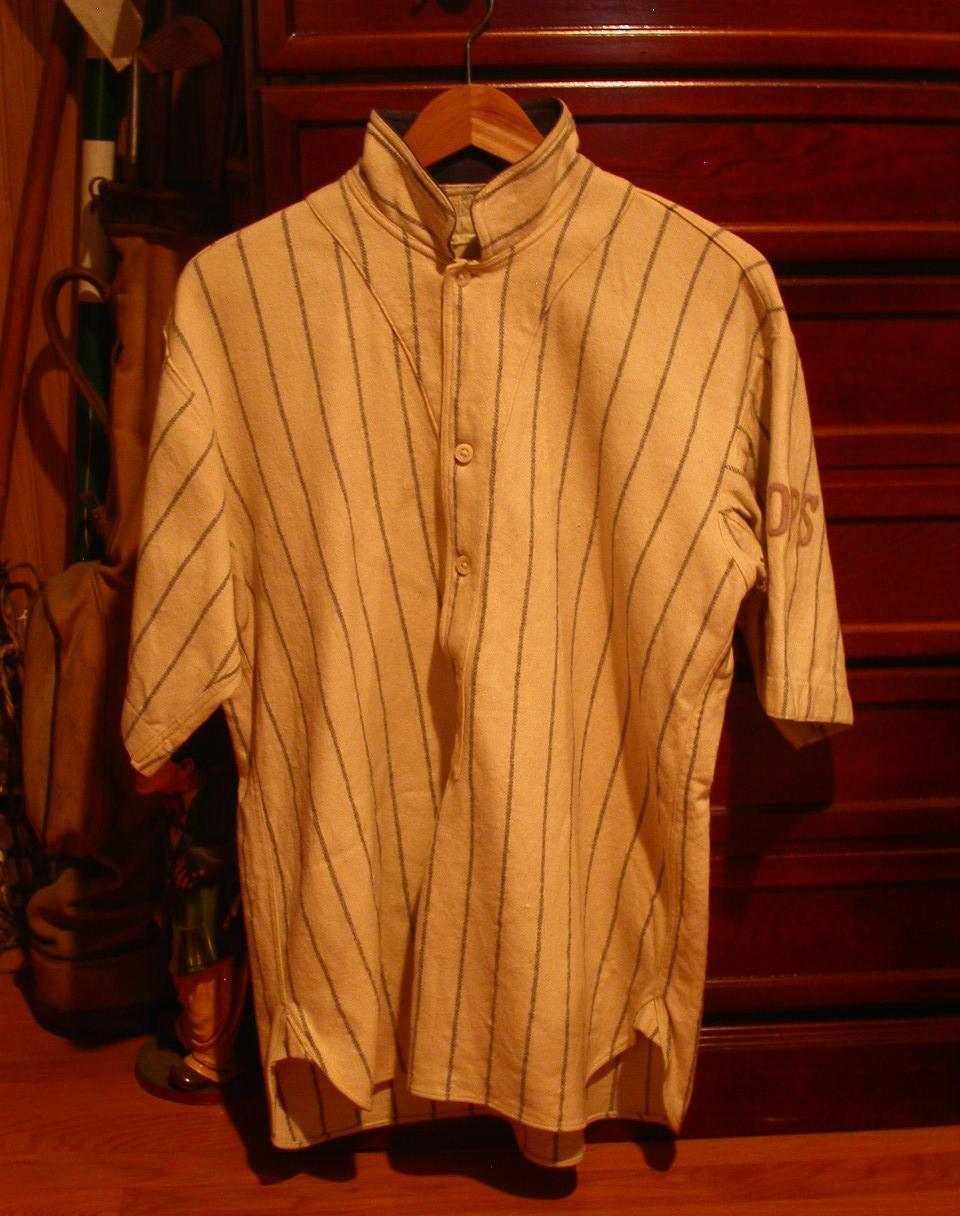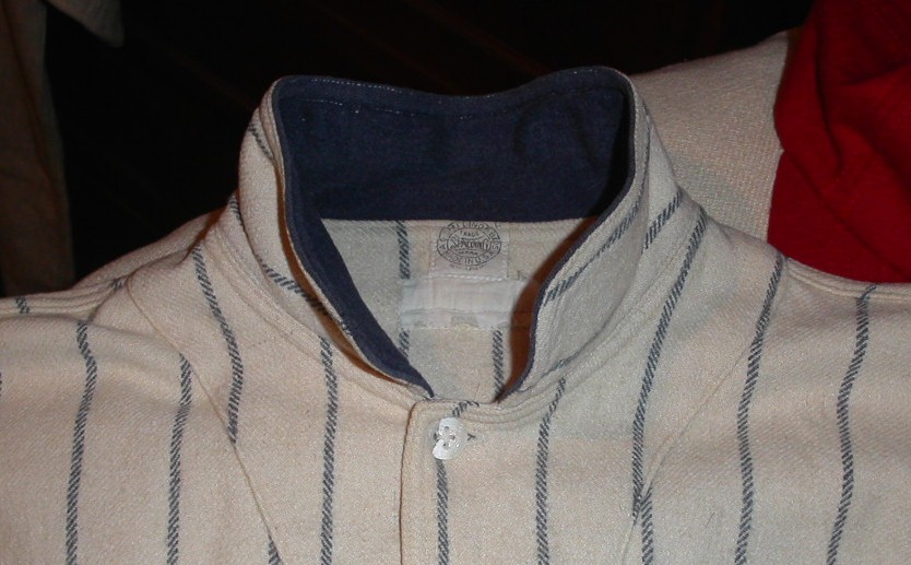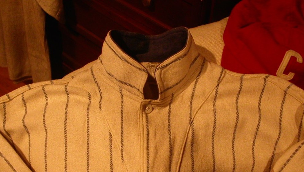 | c. 1920 Spalding Baseball Jersey. Unusual features. Extremely high "military" standing collar - the highest standing collar I have ever come across. Unusual "V" manner in which the jersey is constructed around the neck/buttons. |