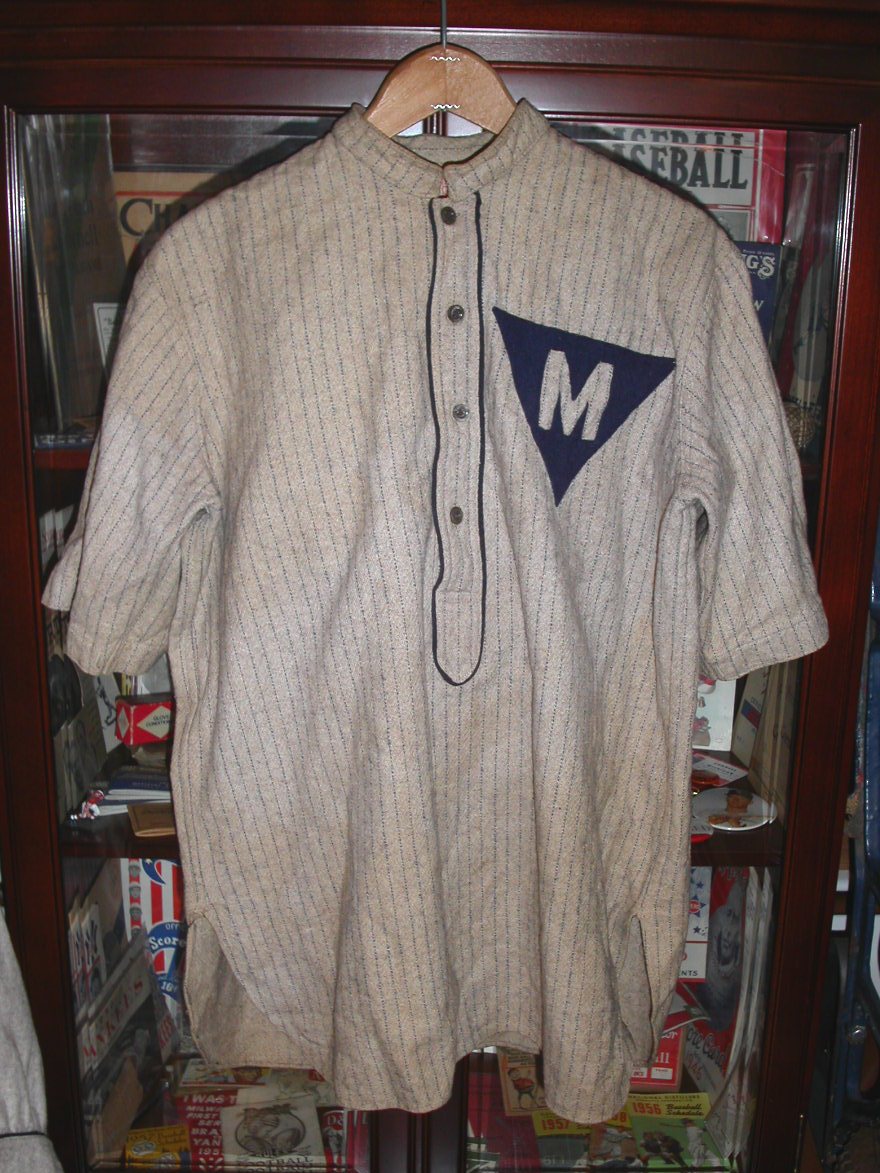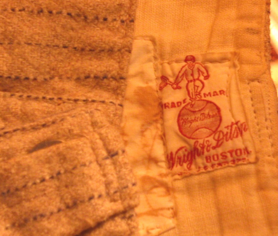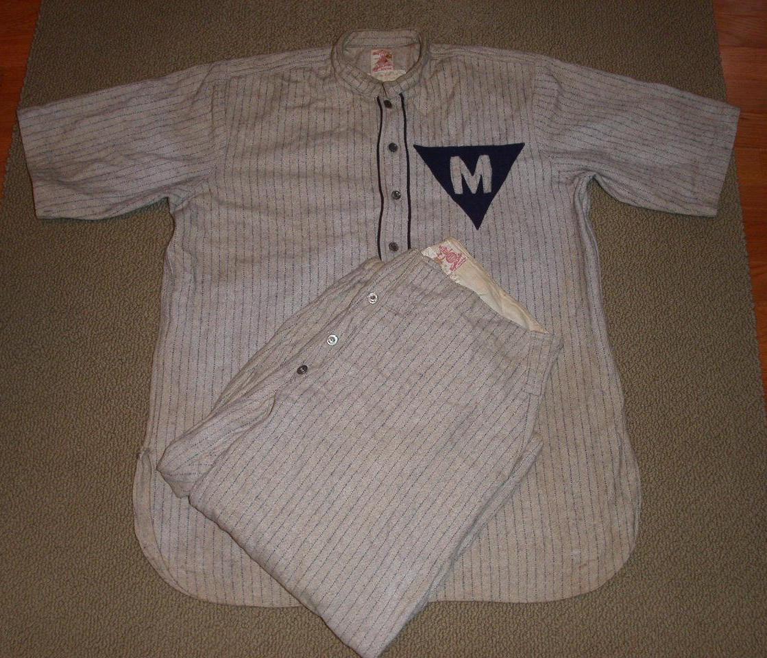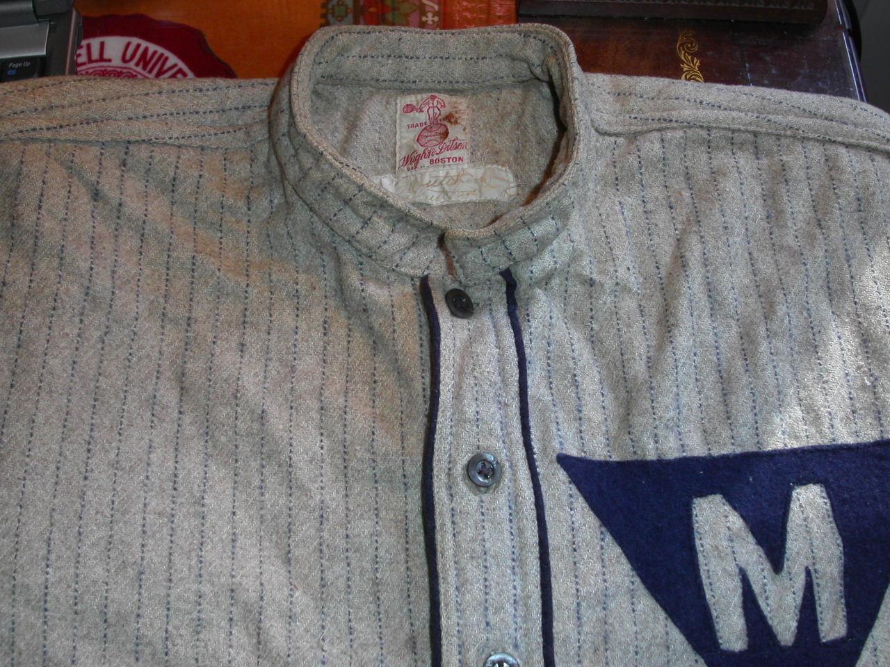 | 1910s Wright & Ditson Cadet Collar Baseball Uniform. Jersey and Pants. 4 button pull-over jersey. Pants have single belt loops and one pocket. Contains 4 button holes at the end of each sleeve for detachable sleeve extensions. Sleeve extensions are missing. |