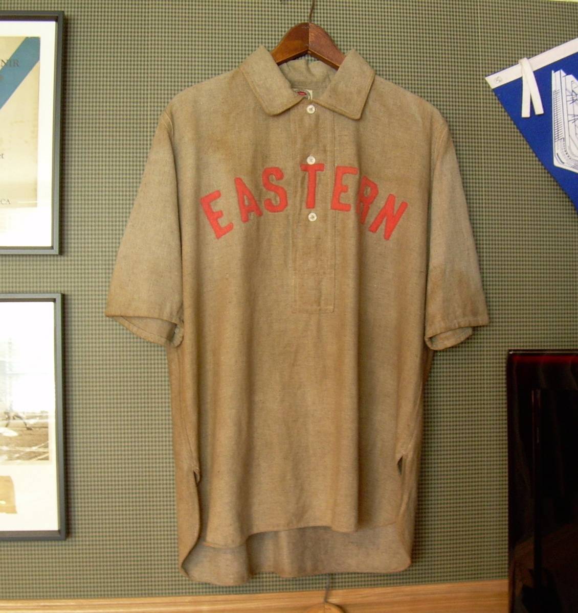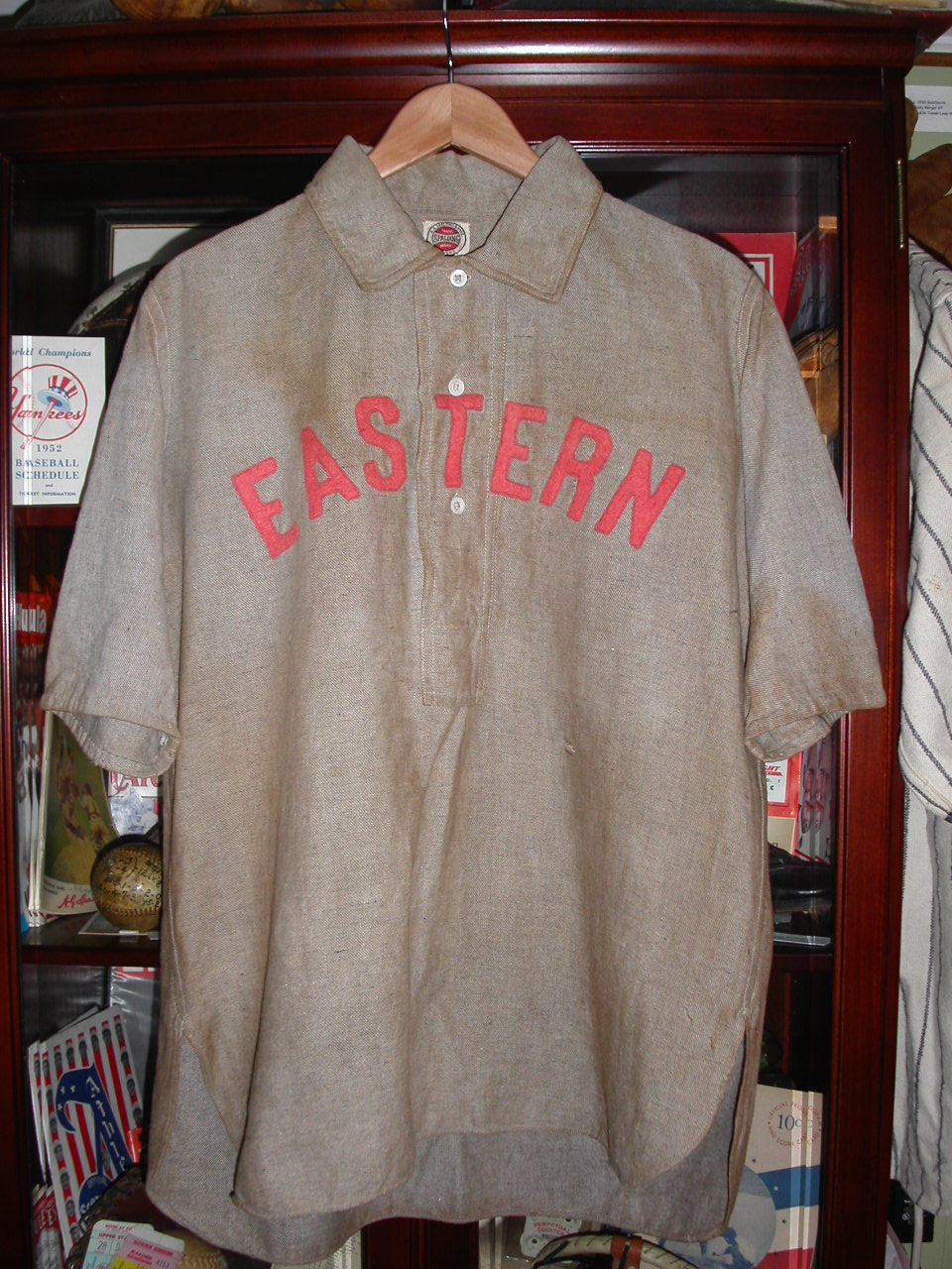 | c. 1902 Spalding Baseball Jersey Turn of the century Spalding full collar pull over baseball jersey. Perfect and brilliant extremely rare Spalding tag in collar. Highest quality heavy wool. Possibly the finest jersey I have ever come across, and the favorite of my collection. |